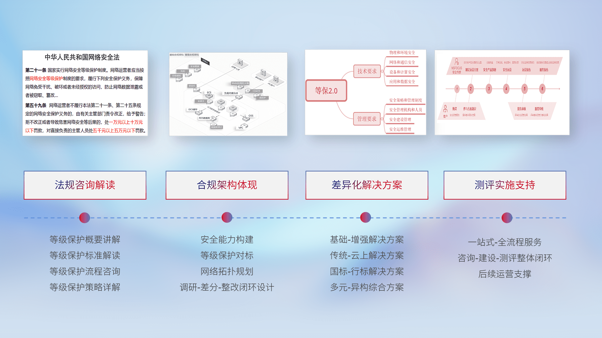 通过专业的法律咨询解读、、、、合规架构体现、、差异化解决方案、、测试实施支持等服务,,,为客户量身打造等保合规体系。。。