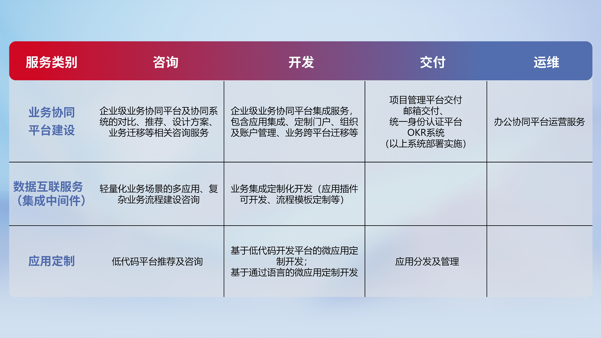 针对钉钉、、企微、、IDaas等平台级产品提供产品的规划、、方案、、、、交付、、、定制化开发等服务,,实现如统一协同办公、、、、智能客户服务、、、、混合会议管理、、、、智能数据查询、、、、等业务场景,,,实现数字化转型。。。